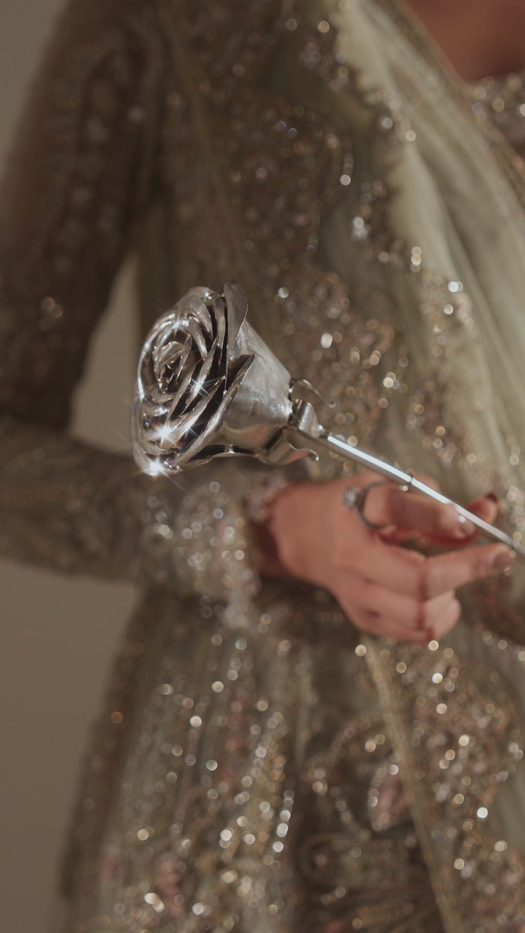 A short shirt paired with a flowy sharara, designed with intricate hand embellishments and dainty embroidery details. The tones are subtle yet rich. Perfect for nikah or intimate wedding festivities. Every stitch speaks of grace, softness, and timeless Soraya charm.