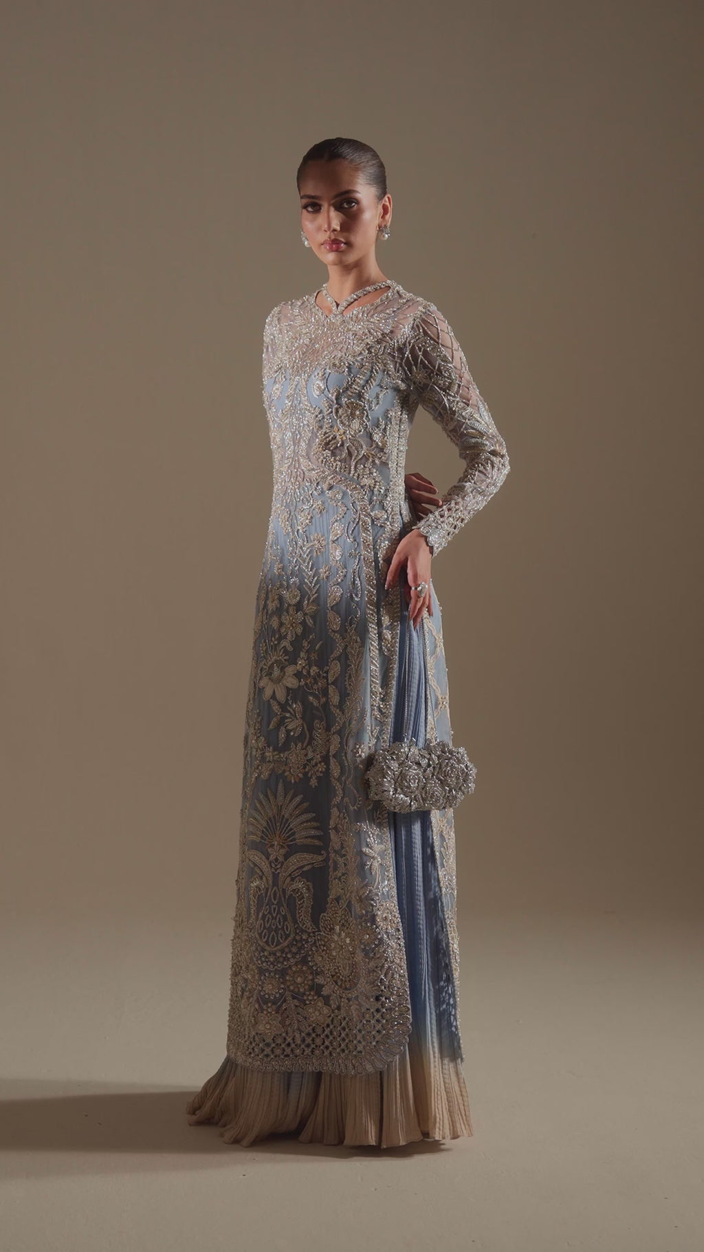 Featuring ombré crushed pants paired with a delicately hand-embellished shirt, this look blends texture and tone effortlessly. The cutwork dupatta adds a refined finish, creating a perfect balance between modern charm and timeless sophistication.