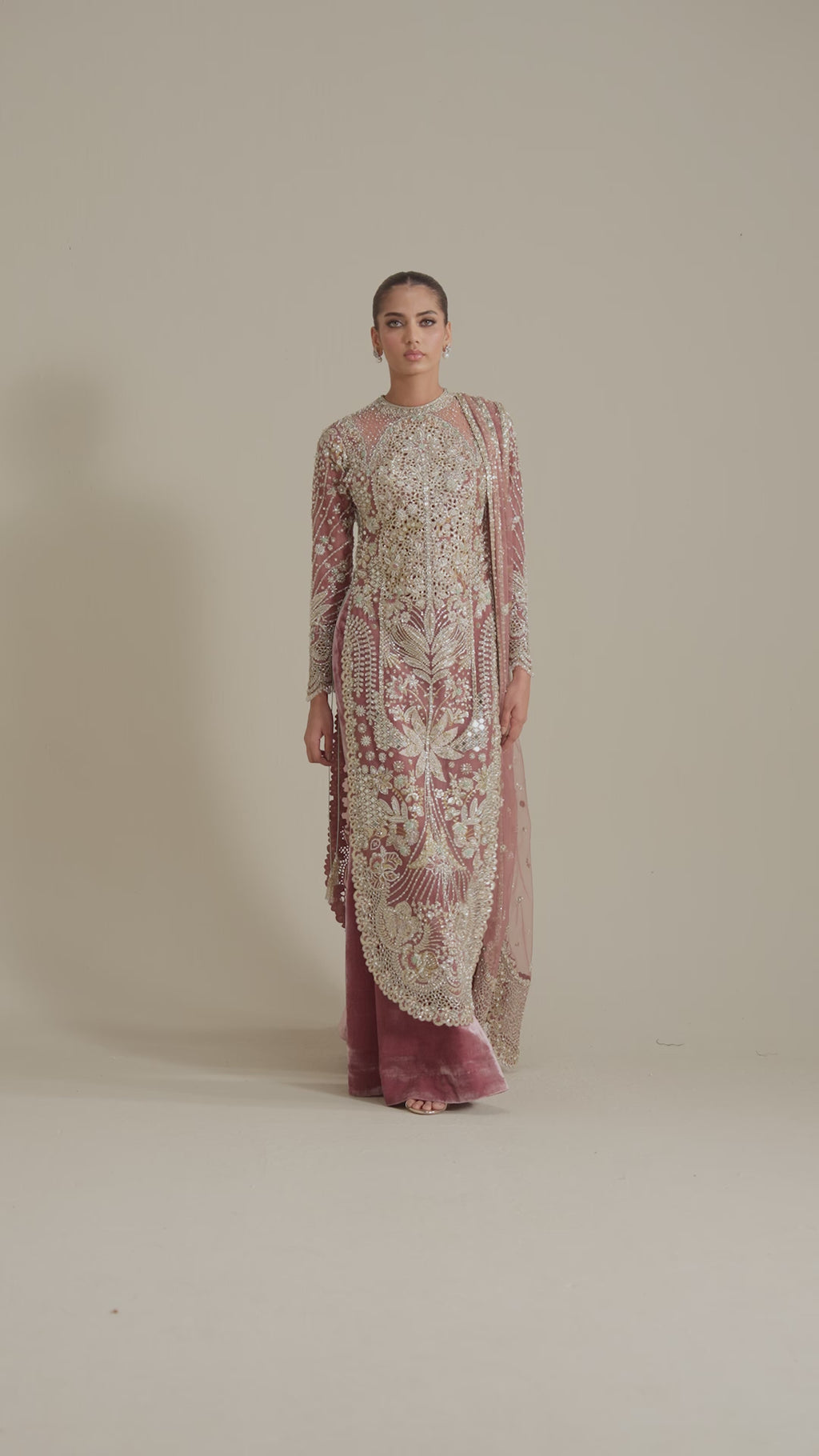 We’ve been obsessed with this rose-pink look ever since it came off the frame. The curved-hem shirt, the velvet pants, the five-panel dupatta, every detail has that touch of softness and luxury we wanted Oriana Luxury Formals '26 to carry.