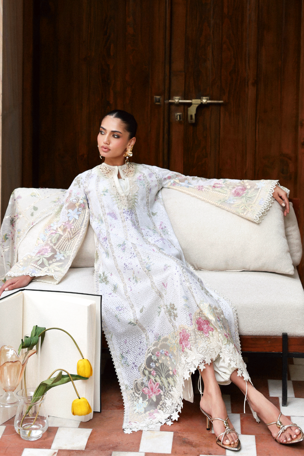 Crafted on delicate schiffli base with layered prints in soft summer pinks and greens, Zaria brings a refined take on modern summer dressing. Paired with statement balloon trousers and a soft cotton net printed dupatta finished with embroidery details, this look moves beyond the idea of a typical lawn outfit.
